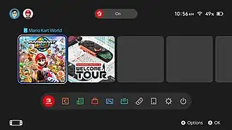 The Nintendo Switch home screen has battery, Internet and time information in the top-right corner, and below it is a grid showing all software on the system, downloaded or physical. Underneath that it has shortcuts to OS functions such as Nintendo Switch Online, GameChat (on Nintendo Switch 2), the News, eShop, Album, GameShare, Controller settings, Virtual Game Cards, System Settings, and a Sleep Mode button.[24] Unlike previous Nintendo systems, the Nintendo Switch home screen currently lacks a web browser and a messaging system.