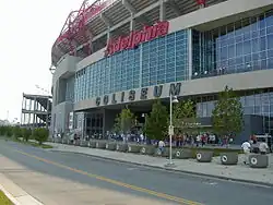 Nissan Stadium is located on the east bank of the Cumberland River, across the river from downtown Nashville and has a seating capacity of 69,143.[17] Its first regular-season game was a 36–35 win over the Cincinnati Bengals on September 12, 1999.[18] Nissan Stadium has been known by Adelphia Coliseum (1999–2002), The Coliseum (2002–2006), and LP Field (2006–2015).[19]