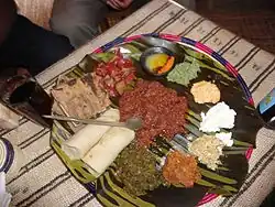 Kitfo is a minced raw beef dish that incorporates niter kibbeh and a spice blend (mitmita). | |