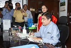 He currently represents the Nagpur constituency in the Lok Sabha and is a lawyer by profession. He has previously served as a Minister in various departments, including Water resources and River development, Shipping, Rural Development and MSME. He is often referred to as the "Expressway Man of India" by the media due to his initiation of the Mumbai-Pune Expressway and his contributions to the development of expressways and other road infrastructure.[6][7] The World Economic Forum has recognised him as the "pioneer of public–private partnership (PPP) in the road sector".[8]
