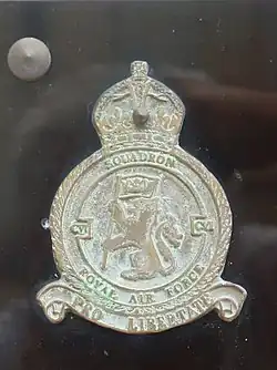 | Squadron Badge | A lion sejant, rampant, holding a banner charged with an astral crown. Based on the crest of the County Borough of Doncaster, the squadron being stationed near there at the time of adopting the badge.[2] |