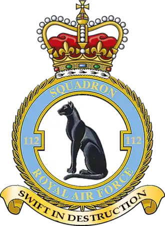 2. ^ "112 Squadron RAF". Royal Air Force Heraldry Trust, the Squadron Badges List. 2014. Retrieved 21 October 2015. A black cat facing left within circle "Fighter Squadron Royal Air Force" surrounded by laurel wreath.