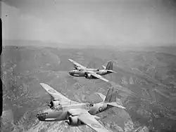 The squadron, part of 326 Wing, moved to Blida in Algeria in November 1942,[28] with the role of supporting the British First Army.[29] The Bisley, however, had poor performance and was vulnerable to fighter attack, and the squadron was therefore largely confined to night bombing.[30] Bisley losses continued to be high, and in January 1943 the squadron relinquished its Bisleys to 614 Squadron, and waited for new aircraft, receiving more Bisleys in February and returning to operations.[31] In March the squadron finally received more modern equipment, replacing its Bisleys with Douglas Boston light bombers, returning to operation with its new aircraft on 21 April.[32][33]
