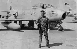 Flying Officer Ehsanul Karim of the No. 17 Squadron with his F-86 at Mauripur Airbase in 1965.