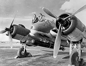 No. 489 Squadron was formed on 12 August 1941 at RAF Leuchars, equipped with Bristol Beaufort aircraft to operate as a torpedo bomber unit of Coastal Command. Its motto in Māori, the indigenous language of New Zealand, was Whakatanagata kia kaha, which can be translated as "Acquit ye like men, be strong".[10] At the time the squadron was formed, there were few New Zealanders with experience operating torpedo bombers so, despite being an Article XV squadron, some personnel were from other countries. It was led by Wing Commander J. Brown who, like his flight commanders, Squadron Leaders B. Sandeman and D. Evans, was an Englishman. Although training was initially on Beauforts, these aircraft were soon required for service in the Mediterranean. They were replaced by the Bristol Blenheim Mk. IVf and then the Handley Page Hampden.[10][11]