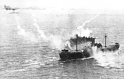 The squadron returned to operations in January 1944 and returned to its anti-shipping duties, targeting merchant vessels, loaded with supplies for the German war effort and often accompanied by flak ships, steaming along the Norwegian coast.[16][19] On the squadron's first sortie with the Beaufighter, it attacked a convoy of ships near the southern coast of Norway. A merchantman of around 12,000 tons was sunk before a group of Messerschmitt Bf 109 fighters saw off the attackers. Another ship, spotted earlier in the sortie, was strafed and badly damaged.[20]