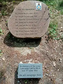 No. 550 squadron was formed at RAF Waltham (near Grimsby), Lincolnshire on 25 November 1943 from 'C' Flight of 100 Squadron.[6] Equipped with Avro Lancasters, they began operating in the same month, as part of No. 1 Group RAF. The squadron's commanding officer, until 17 May 1944, was Wing Commander James Johnson Bennett.[7] The squadron motto was "Per Ignem Vincimus", (Latin: through fire we conquer).