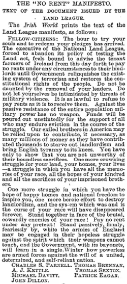 'FELLOW-CITIZENS: The hour to try your souls and to redeem your pledges has arrived. The executive of the National Land League, forced to abandon its policy of testing the Land act, feels bound to advise the tenant farmers of Ireland from this day forth to pay no rents under any circumstances to their landlords until Government relinquishes the existing system of terrorism and restores the constitutional rights of the people. Do not be daunted by the removal of your leaders. Do not let yourselves be intimidated by threats of military violence. It is as lawful to refuse to pay rents as it is to receive them. Against the passive resistance of the entire population military power has no weapon. Funds will be poured out unstintedly for the support of all who may endure eviction in the course of the struggle. Our exiled brothers in America may be relied upon to contribute, if necessary, as many millions of money as they have contributed thousands to starve out landlordism and bring English tyranny to its knees. You have only to show that you are not unworthy of their boundless sacrifices. One more crowning struggle for your land, your homes, your lives – a struggle in which you have all the memories of your race, all the hopes of your kindred and all the sacrifices of your imprisoned brothers.