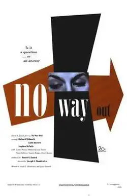 No Way Out is a 1950 American crime drama film noir[4] directed by Joseph L. Mankiewicz and starring Sidney Poitier in his film debut, alongside Richard Widmark, Linda Darnell and Stephen McNally. The film centers on an African American doctor who confronts the racism of a poor slum after he treats a racist white criminal.