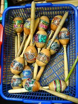 South Asian music places a special emphasis on drumming, which is freed from the primary time-keeping function of drumming found in other part of the world.[18] In North India, secular processional bands play an important role in civic festival parades and the bārāt processions leading a groom's wedding party to the bride's home or the hall where a wedding is held. These bands vary in makeup, depending on the means of the families employing them and according to changing fashions over time, but the core instrumentation is a small group of percussionists, usually playing a frame drum (ḍaphalā), a gong, and a pair of kettledrums (nagāṛā). Better-off families will add shawms (shehnai) to the percussion, while the most affluent who also prefer a more modern or fashionable image may replace the traditional ensemble with a brass band.[19] The Karnatic music of southern India includes a tradition of instrumental temple music in the state of Kerala, called kṣētram vādyam. It includes three main genres, all focussed on rhythm and featuring unpitched percussion. Thayambaka in particular is a virtuoso genre for unpitched percussion only: a solo double-headed cylindrical drum called chenda, played with a pair of sticks, and accompanied by other chenda and elathalam (pairs of cymbals). The other two genres, panchavadyam and pandi melam add wind instruments to the ensemble, but only as accompaniment to the primary drums and cymbals. A panchavadyam piece typically lasts about an hour, while a pandi melam performance may be as long as four hours.[20]