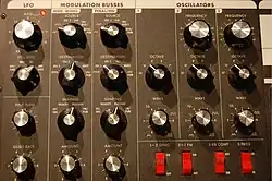 Some of the Minimoog Voyager controls. Note the NOISE/PGM option on the top rotary switches controlling the modulation busses.