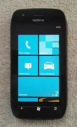Nokia Lumia 710 is a Windows Phone 7 smartphone.[5] Its release is part of a change in company's direction which has resulted in a shift from Symbian platform towards Windows Phone for smartphones. While the Nokia Lumia 800 and Lumia 900 target the high-end of the smartphone marketplace, the Lumia 610 and Lumia 710 are aimed at the mid-range price point.[6] This generation of Lumia phones ship with Windows Phone 7.5 "Mango". Its design is almost the same as the Symbian Nokia 603, announced just over a week earlier.[7][8]