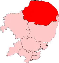 After the 1984 boundary changes based on the new UK parliamentary constituencies created in 1983, it consisted of the constituencies of Great Yarmouth, Mid Norfolk, North Norfolk, North West Norfolk, Norwich North, Norwich South, South Norfolk and South West Norfolk.[2]