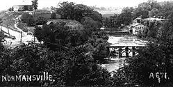 Normansville was originally called Upper Hollow; it was named for the deep ravine carved by the Normans Kill in which it was located. Further downstream was Lower Hollow, later named Kenwood. Upper Hollow had its start in 1805 with the construction of the Delaware Turnpike, which ran from Albany to Otego (which then was part of Delaware County).[1] The turnpike was carried over the Normans Kill (kill is the middle Dutch word for "stream") by a 100-foot-long (30 m) wooden bridge. Northwest of this bridge was a toll gate. The wood bridge was washed away by a freshet in 1869[2] (one year after the turnpike company had abandoned the turnpike) and the town of Bethlehem built an iron bridge in its place.[1][2]