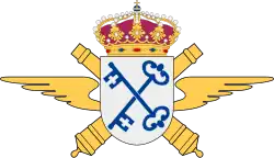 The coat of arms of the unit was used from 1977 to 2004. Blazon: "Argent, the town badge of Luleå, två keys azure in saltire, sinister inverted. The shield surmounted two gunbarrels of older pattern in saltire and two wings, both or."[10]