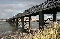 Two viaducts south of Montrose were designed by Sir Thomas Bouch, the architect of the original Tay Bridge but, due to delays in building the Tay Bridge and the line by Dundee, they were not built until 1879.[10] Construction was by Gilkes Wilson and Company, supervised by Bouch's son, William.[11] The more northerly bridge, the South Esk Viaduct, was of iron lattice girder construction.[12][note 3]