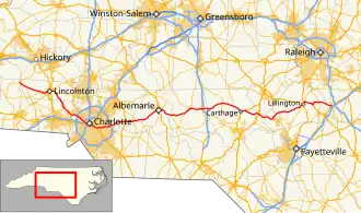 On the east side of Charlotte, it begins its 100-mile (160 km) long concurrency with NC 24, approximately 1/2 of its total length. The two highways leave the city along Albemarle Road and remain joined until the unincorporated community of Johnsonville. Along this segment, they pass through the cities of Midland, Locust, Albemarle, Troy, Biscoe, and Carthage. They share further concurrencies with NC 109, NC 22, and US 15.