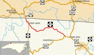 North Carolina Highway 93 (NC 93) is a primary state highway in the U.S. state of North Carolina. It runs from the Virginia state line to the community of Twin Oaks, entirely in Alleghany County.