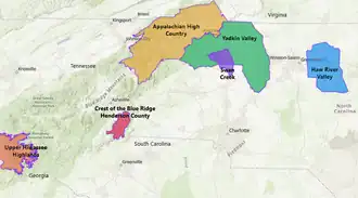 | Sub-regions | Appalachian High Country AVA, Crest of the Blue Ridge Henderson County AVA, Haw River Valley AVA, Swan Creek AVA, Upper Hiwassee Highlands AVA, Yadkin Valley AVA |