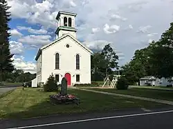 "4263 State Route 203. Methodist Episcopal Church. c. 1834–1836, 1867 and c. 1900 (contributing building) Two-story wood frame dwelling with fully-pedimented facade with layered detailing including original late Federal style and subsequent Italianate and Colonial Revival style finishes. The building has self-contained massing and was built on a rectangular-shaped footprint, the ridge of its medium-pitched roof aligned with the longer north and south flank elevations. A Late Victotian-era wrap-around porch is present on the facade and is carried round the north elevation. The main roof is covered in standing-seam metal and there are two brick chimneys, one each on the north and south roof slopes. The house is clad in vinyl siding with exposed wood trim and eave details, including a bracketed and denticulated frieze and molded comice. A decorative elliptical-shaped motif is featured in the tympanum of the pediment. The primary^ door is Italianate in style and features double-leaves with round-arched heads. There is a colored-glass casement window centered on the second floor, flanked by tripartite windows with central one-over-one sash bordered by narrower colored glass in a diamond-pane pattern; windows hung with one-over-one wood sash windows throughout, with one colored-glass casement window present at the center of the second floor east. The porch is sustained by paired Tuscan-order wood colonettes and has a standing-seam metal roof. A Colonial Revival-style porch supported on two Tuscan-order wood colonettes is present at the center of the south elevation."[2] The property also includes:
