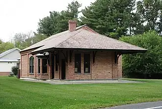 "Also representative of a distinctive non-domestic building typology is the former North Chatham Trolley Station, ca. 1900, which has recently been restored. It is the only brick building included within the historic district; both its brick walls and slate roof afforded it a greater measure of durability and fire protection than frame buildings. It is of a characteristic form for a small rural trolley or train station at the turn of the twentieth century, by which time this building type had assumed distinctive traits, as expressed in its low-slung linear form—in this instance combining gabled and hipped roof masses—with prominent bracketed overhang to shield passengers from the elements."[2]
