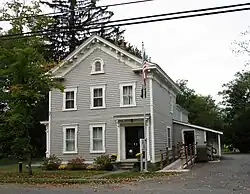1889 (contributing building) "This building was used in other village locations until moved here in 1914 to serve as the library; a restoration was completed in 2007. It is a one-story wood-frame building with gable roof, and vertically-oriented, corrugated-metal siding and roof There are double-hung wood windows with segmented-arched heads windows on the north and south facades with sawn finials. There is a covered entrance porch with a frame, elliptical-arched roof The east entrance, which is partially glazed, is likely original. The interior has been restored (2007) and features wood floor boards, vertically oriented corrugated-metal wainscot and painted sheetrock walls above."[2]