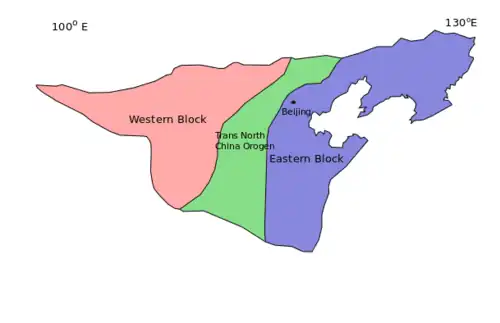 North China Craton consists of two blocks, the western and The Eastern Block, which are separated by a Trans-North China Orogen. The two blocks are of distinct characteristic.[2][1]