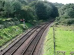 Starting from Sheringham station, the lines follows the coast westwards, soon passing over the Automatic Open Crossing at Sweetbriar Lane, where the private road leading to Sheringham Golf Club crosses the line.[35] The line climbs a 1 in 97 gradient, with the golf course, and Skelding Hill,[36] on the seaward side of trains, while the A149 can be seen on the landward side of trains, roughly paralleling the tracks with Upper Sheringham visible in the distance. During WW2, Skelding Hill was the location for an emergency coastal battery, complete with an underground headquarters bunker.[37]
