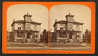 ![]() Stereo card of the H.F. Day house, 605 NE Madison St., in the late 1800s. The house is a contributing property. | |