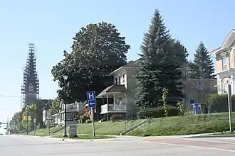 It is a residential district with homes in various sizes and styles, unified by a lot of local cream brick.[3][4] Examples include the 1849/1870 Italianate Kusel house,[5] the 1855 simple front gable house at 423 N Church,[6] the 1877 Second Empire Cody house,[7] the 1894 Queen Anne Woodard house,[8] the 1910 American Foursquare Schimmel house,[9] the 1915 Craftsman Calhoun house,[10] the 1929 Dutch Colonial Revival Baumann house,[11] and the 1930 Tudor Revival Salick house.[12]