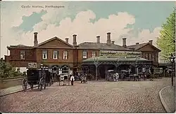 The main station building, a two-storey structure in the Italianate style, was located on the up side and consisted of a central block with two cross-wings.[30] The wings had gable roofs, whereas the central part had a low-pitched hipped roof.[30] Two standard L&NWR signal cabins were positioned to the north and south of the platforms, these being known respectively as Northampton No. 1 and No. 2 boxes.[30] Other signal cabins, Northampton No. 3 and No. 4, were sited further north and controlled extensive marshalling yards.[30] A fifth cabin at Duston West Junction lay to the south-west; it controlled the apex of the Northampton triangle.[30] No. 2 was the largest signal cabin with 118 levers which controlled the country end of the station, access to the goods shed and the south end of the goods yard.[31]