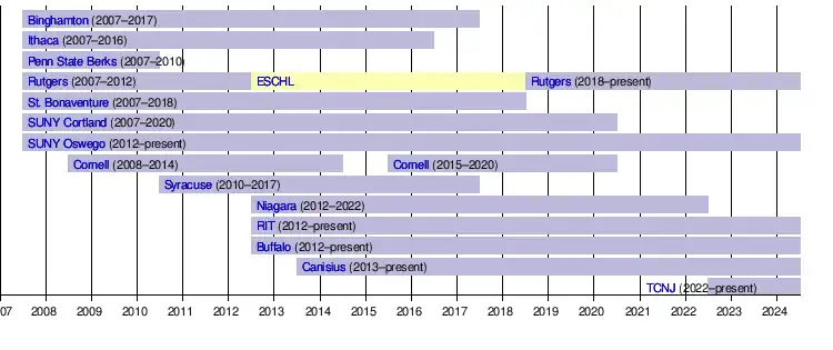 Ahead of the 2010–11 season, Syracuse University joined the NECHL from the Eastern Collegiate Hockey League.[2] By 2013, the Orange were joined by four more former ECHL schools; Niagara University, Rochester Institute of Technology, University at Buffalo, and Canisius University.[3]