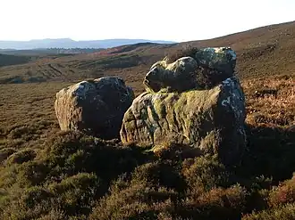 The Northumberland Sandstone Hills lie not far from the coast of Northumberland and the region is listed as National Character Area no. 2 by Natural England, the UK Government's advisor on the natural environment. The region covers an area of 72,694 hectares (281 sq mi), beginning at Kyloe in the north and running in a strip roughly 10–15 kilometres (6–9 mi) wide and parallel to the coastal plain as far as Alnwick, where it changes direction to head southwest via Thrunton Wood, Rothbury Forest and Harwood Forest to the area of Throckington and the River Rede, passing over the highest peaks in the area, including Tosson Hill (1,444 feet (440 m)) in the Simonside Hills. The region has a range of semi-natural habitats: moorland with heather and rough, acid grassland mosaics on the thin, sandy soils of the higher steeper slopes and broken ground, transitioning through scrub, and oak or birch woodland to improved farmland and parkland on the lower slopes. Wet peaty flushes, mires, loughs and small reservoirs are dotted throughout the area [1] and there are many caves, including St Cuthbert's Cave and Cateran Hole.[2]
