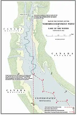 The northwesternmost point of the Lake of the Woods was a critical landmark for the boundary between United States territory and the British possessions to the north. This point, on the shore of the Lake of the Woods, was referred to in the Treaty of Paris in 1783[1] and in later treaties including the Treaty of 1818. The point lies at the corner of the Northwest Angle in the U.S. state of Minnesota, and is thus the northernmost point of the contiguous United States. After Canadian Confederation, the point became the basis for the border between the Canadian provinces of Manitoba and Ontario.