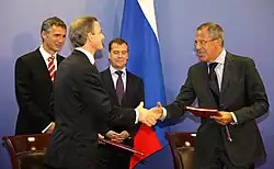 During a meeting in Oslo on 27 April 2010, President of Russia Dmitry Medvedev and Prime Minister of Norway Jens Stoltenberg announced that the territorial dispute in the Barents Sea was settled.[47][48] The agreement is a compromise which divides a disputed area of around 175,000 square kilometers (68,000 sq mi) into two approximately equally sized parts.[41] The agreement was signed on 15 September 2010 in Murmansk by Medvedev and Stoltenberg.[49][50] The Parliament of Norway unanimously approved the treaty on 8 February 2011. The debate lasted only an hour, and all representatives of Norwegian political parties praised the agreement.[51] On 30 March, Russia's State Duma also voted in support of ratification, despite strong opposition from Communist Party representatives. Medvedev signed a law ratifying the treaty on 8 April 2011. The law was titled Federal Law on Ratification of the Treaty between the Russian Federation and the Kingdom of Norway on Maritime Delimitation and Cooperation in the Barents Sea and the Arctic Ocean.[49] After ratification by both countries, there was a 30-day waiting period before it came into force.[52] The treaty entered force on 7 July 2011, ending the 44-year-old border dispute.[53]