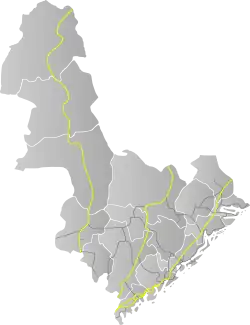 Norwegian county road 413 (Fv413) is a Norwegian county road in Agder county, Norway. The 15-kilometre (9.3 mi) long road which runs between the village of Dølemo in Åmli municipality and just west of the village of Mykland in Froland municipality. The northern junction at Dølemo connects with the Norwegian National Road 41. Near the northern end of the road, the Norwegian County Road 272 which heads north into the Tovdal valley. The southern junction joins the Norwegian County Road 42 just west of the village of Mykland. The road runs mostly through a rural forested area during its entire length.[1]
