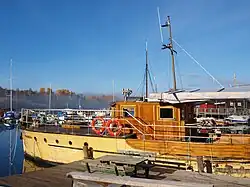 M/B “Hauka” is a 16.5-metre (54 ft) long vessel drawn by the engineer Richard G. Furuholmen and built at Moen Yard in Risør in 1934. The vessel was ordered by the company Albert Collett, and assigned to Salsbruket Pulp Mill where it was operative until 1985 except for the duration of World War II. The Germans then requisitioned it for their military base in Rørvik. The vessel was mainly used for towing of raw material to the pulp mill. In winter it could also be used for ice breaking whenever needed. Moreover, it was used to transport the owners and their families when they left the capital to come on a visit. The boat then looked glamorous, neatly cleaned and shined up for the occasion.