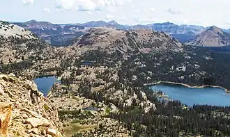 Notch Mountain is located 50 miles (80 km) east of Salt Lake City in the Uinta-Wasatch-Cache National Forest.[2] It is situated in the western Uinta Mountains which are a subrange of the Rocky Mountains. Precipitation runoff from this mountain drains north into headwaters of the Weber River and south into headwaters of the Provo River. Topographic relief is significant as the summit rises 1,100 feet (335 meters) above Wall Lake (source of the Provo River) in 0.75 mile (1.2 km). Access to the mountain is via the Mirror Lake Highway and hiking the 10-mile Notch Mountain Trail which passes through "The Notch", but does not lead to the summit.[4] The Notch is a 10,621-foot-elevation gap between the 11,263-ft east peak and the 11,258-ft west peak.[5][6] The mountain's descriptive toponym was officially adopted in 1932 by the U.S. Board on Geographic Names.[7]