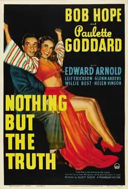 Nothing but the Truth is a 1941 American comedy film directed by Elliott Nugent and starring Bob Hope, Paulette Goddard and Edward Arnold.[1][2] It was produced and distributed by Paramount Pictures. It was Hope and Goddard's third movie together in three years..[3][4]
