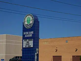 Notre Dame de la Baie Academy (known locally as Notre Dame or simply NDA) is a co-educational Roman Catholic high school in Green Bay, Wisconsin. The name is French for "Our Lady of the Bay". Located in the Roman Catholic Diocese of Green Bay, and co-sponsored with the Norbertine Order, Notre Dame has an enrollment of approximately 750 students.