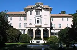 The Notre Dame de Namur University campus developed around Ralston Hall Mansion. William Chapman Ralston built Ralston Hall shortly after purchasing the property in 1864.[18] William Ralston was a pivotal figure in the gold and silver bonanzas, which helped Ralston amass wealth. Ralston Hall was built with a steamboat gothic design on the interior, which is rumored to have been influenced by Ralston's love of boating from a young age.[19] The interior of Ralston Hall is strikingly shaped like the inside of a boat.[19] Ralston Hall was built as an entertainment destination.[19] After William Ralston died, his business partner, William Sharon, came to control the mansion.[19] Sharon was a United States senator representing Nevada from 1875 to 1881.[19] Ralston Hall has been used for a variety of jobs throughout its history; Ralston Hall held one of the largest American weddings when William Sharon's daughter Flora married Sir Thomas Fermor-Hesketh of England.[19] The mansion was a finishing school for young women until 1898.[20] Since 1923 Ralston Hall has been affiliated with Notre Dame de Namur University.[20]