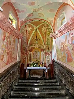 Nova Štifta is best known for its pilgrimage church dedicated to the Assumption of Mary. It is a Baroque church with an exterior arcade. It was built between 1641 and 1671[4] and was commissioned by the Jurij Khisl, lord of the castle in Ribnica, after a mysterious light appeared at Juniper Hill (Brinov vrh, 622 meters or 2,041 feet), as the site is known. The church has an octagonal nave and a smaller square chancel with beveled corners. The cupola rises 27 meters (89 ft) and is topped by a belfry with a Baroque roof. The church is probably based on the Renaissance Coronation of the Virgin Church in Lodi, Italy, which was a model for many later churches in Slovenia.[5]