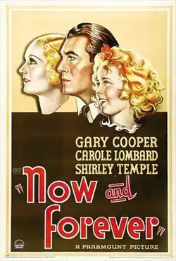 Now and Forever is a 1934 American drama film directed by Henry Hathaway. The screenplay by Vincent Lawrence and Sylvia Thalberg was based on the story "Honor Bright" by Jack Kirkland and Melville Baker.[1] The film stars Gary Cooper, Carole Lombard, and Shirley Temple in a story about a small-time swindler going straight for his child's sake. Temple sang "The World Owes Me a Living," introducing the future standard. The film was critically well received. Temple adored Cooper, who nicknamed her 'Wigglebritches'.[2] This is the only film in which Lombard and Temple appeared together.