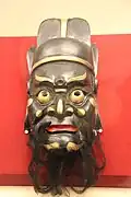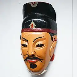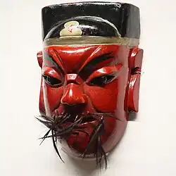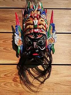 The number of masks used in one drama ranges from several dozen to two hundred. There are five kinds of masks used in Nuo Drama, namely: civilian general, military general, old general, young general and woman general with other minor roles such as soldiers and Taoist monks.[3] Each nuo mask has a fixed name, represents a certain role and has legendary stories to tell of its origins. In Guizhou, a province with the largest nuo drama repertoire, at least 24 masks are required to perform an entire nuo drama piece. The masks can appear valiant and martial, stern and tough, or gentle and kind, and they come in various styles to represent different figures. For instance, since the responsibility of valiant gods is to emit awe and dispel ghosts and devils, their masks usually have horns and buckteeth, with a very ferocious countenance.[15]