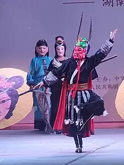 Nuo theatre,[1][2] Nuo drama,[3] Nuo opera,[4] or Nuoxi (traditional Chinese: 儺戲; simplified Chinese: 傩戏; pinyin: nuóxì) is a traditional theatrical art popular in many regions of China. Characterized by its special features such as ferocious masks, unique dresses and adornments, the strange language used in performance, and mysterious scenes, Nuo theatre has been selected as one of the non-material cultural legacies of China. The opera is a religious performance intrinsic to the culture of Nuoism, a type of Chinese folk religion. The purpose of Nuo theatre is to drive away devils, disease and evil influences, and also to petition for blessings from the gods. Singing and dancing are included in Nuo theatre and performers wear costumes and masks.