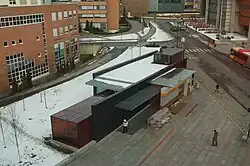 Nydalen Station is an underground station located on the tunnel section of the Ring Line between Tåsen and Storo. The 4,000 square metres (43,000 sq ft) station was drawn by architect Kristin Jarmund.[9] The station's center platform is located 12 metres (39 ft) underground, with an entrance pavilion at street level. The pavilion has a composition of horizontal and vertical levels and planes. Between these, which are dynamically cast in relation to each other, are the modes of descent down to the platform area: i.e. elevators, escalators and staircases. The planes were built of black basalt, supplemented with large glass spaces that opens up the pavilion. A red glass box, that symbolizes the red trains, stands as a "signal". The platforms is 110 metres (360 ft) long, allowing for six-car trains, and is covered with white granite and a paneled ceiling. The rail area has black concrete walls. There is effect lighting around the columns and recessed spotlights horizontally along the platform. The station is owned by Kollektivtransportproduksjon.[10]
