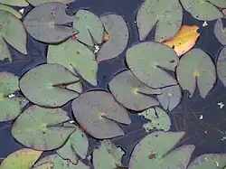 Nymphaea × helvola is a rhizomatous,[9] perennial,[10] aquatic[11] herb.[10] The small,[6] dark green,[12] oval[13] to orbiculate leaf with an entire margin[14] is 5[13]–12 cm long,[15] and 7 cm wide.[13] The leaf displays brown to red marbling and spotting.[12]