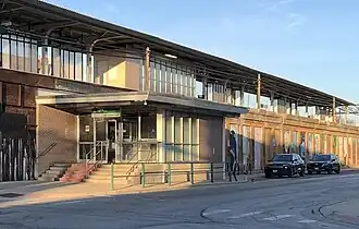 On October 28, 1962, the station was elevated on an embankment and the main entrance was rebuilt by taking advantage of the small space along the road to include a ticket window and enclosed waiting rooms. When the Green Line closed for a renovation project in 1994, the CTA had planned to permanently close the Oak Park station along with four other stations (Austin, Laramie, Homan and Halsted). However, due to the political pressure and complaints of residents, the station was retained without being rebuilt and reopened with the Green Line on May 12, 1996. When it reopened, a committee of residents of Oak Park with disabilities strongly protested it as one of the few stations of the Green Line that is not accessible to people with disabilities.[2]
