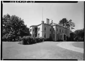 The Oaklands mansion house stands overlooking the Kennebec River, west of River Road and south of Cottage Road, on the larger Oaklands estate, and is accessed by dirt roads from the north and east. The house has a two-story main block with hip roof, and a three-story ell extending to its west. It is built out of ashlar granite, and features a crenellated parapet around the roof edge, and a projecting bastion-like turret at one corner. It was built out of stone quarried nearby in Hallowell.[2] The larger estate consists of the aforementioned Oaklands mansion, Hallowell House, pond house, and orchard house. It is used as a farm, with sheep, cows, goats, and pigs bring raised on the property.