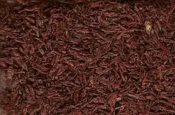 Oaxaca's dietary staple is corn, which has been Mexico's for over 7,000 years.[7] Corn is generally dried and ground to create a dough, which is used for a number of dishes, including entomatadas, empanadas, and tamales. Tortillas are called blandas and are a part of nearly every meal.[3] The main flavoring agent is the chili pepper, with varieties such as amarillos, chilhuacles, chilcostles, and costeños, but the most distinctive is the pasilla oaxaqueña chile.[1][3] Characteristic herbs include hoja santa, often used in chicken, pork, and fish dishes as well as mole verde, along with epazote and pitiona.[3] Two well-known aspects of the cuisine are the use of chocolate for drinking and various edible insects, especially grasshoppers called chapulines (see below). Lesser-known regional specialties include ice cream flavored with rose petals, and squash flowers found in empanadas, quesadillas, soups, and more.[1][8][9]